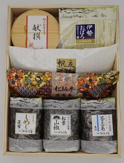 極上松茸昆布「献撰」、太白おぼろ、帆立昆布巻、松阪牛昆布巻、しめじ昆布、ふりかけ昆布「松葉山椒」、ちりめん昆布「答志島」杉箱入り】